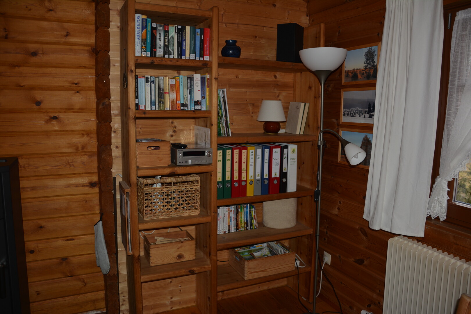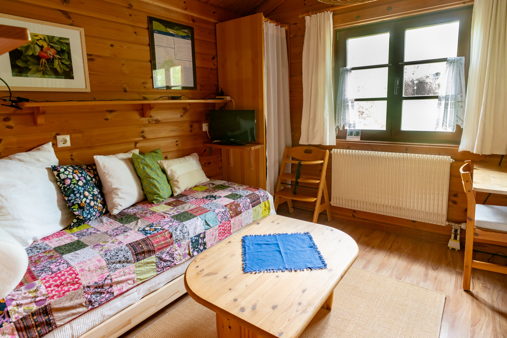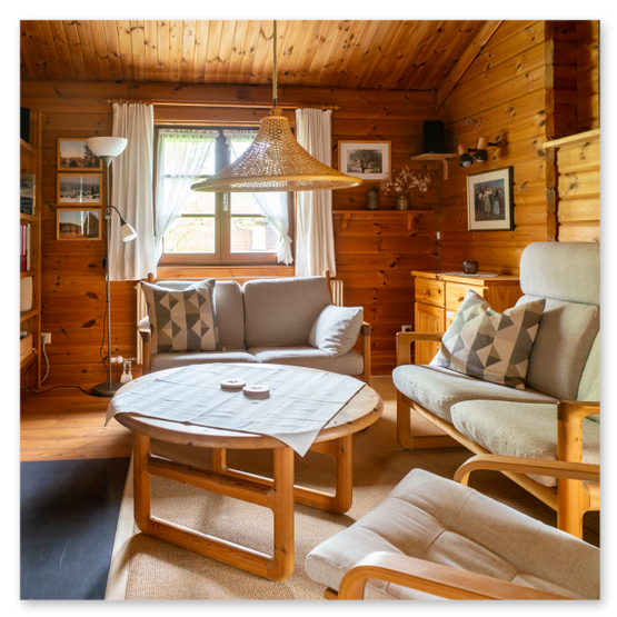 Das gemütliche Wohnzimmer mit bequemen Sitzmöbeln, großzügigem Wohnzimmertisch, Kaminofen und Fernseher mit Kabelanschluss und DVD-/BlueRay-Player lädt bei jedem Wetter zum Verweilen ein. Zur Unterhaltung steht eine Sammlung an Spielen, Büchern, DVDs und CDs zur Verfügung. Von dem bodentiefen Wohnzimmerfenster gelangt man direkt auf die überdachte Terrasse.