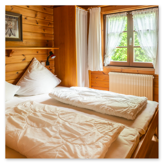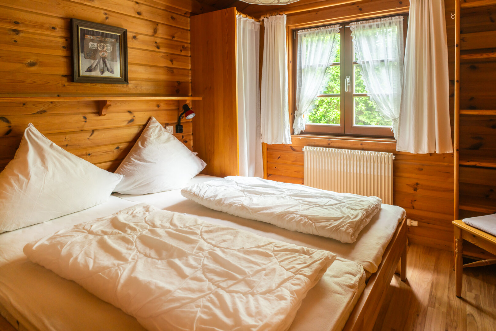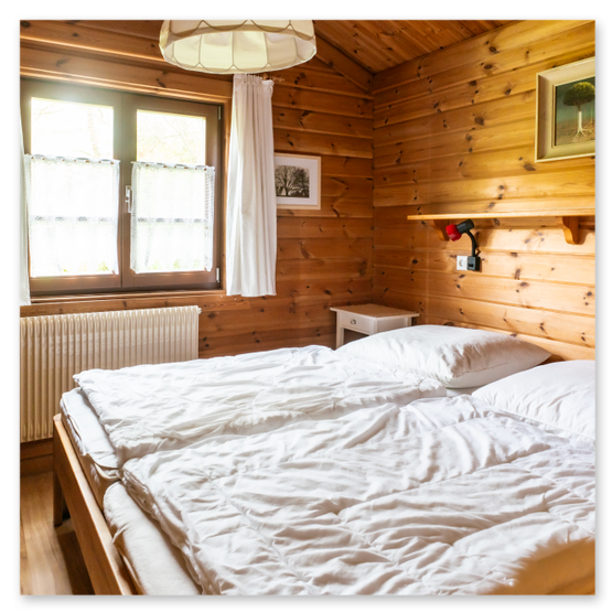 Die beiden Schlafzimmer sind mit einem großen Doppelbett ausgestattet. Sie befinden sich auf unterschiedlichen Seiten des Hauses und bieten so jedem den perfekten Rückzugsort. Die Fenster können von außen mit Holzklappläden verdunkelt werden. Im Schlafzimmer 1 besteht die Möglichkeit, ein Kinderreisebett (steht zur Verfügung) aufzustellen.