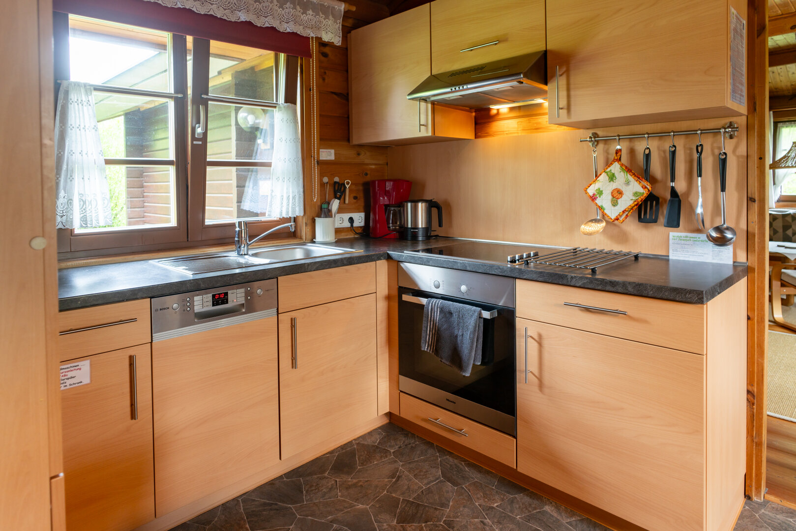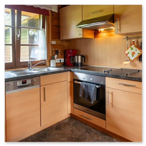 Die neuwertige Einbauküche mit Arbeitsplatte und Boden in Stein-Optik ist komplett ausgestattet mit Kühlschrank, Herd, Backofen, Mikrowelle, Spülmaschine und allem, was man sonst noch so zum Kochen braucht. Die gemütliche Essecke direkt daneben bietet Platz für alle, ohne beengt zu wirken.