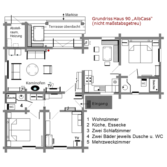 Das AlbCasa bietet 2 Schlafzimmer mit jeweils angrenzendem Bad, Küche/Esszimmer, Wohnzimmer, Mehrzweckzimmer und einen geräumigen Flur. Zusätzlich gibt es eine große überdachte Terrasse mit Markise und ein von außen begehbaren Technikraum. Das Haus ist komplett aus Holz, wirkt daher rustikal und ist sehr liebevoll und hell eingerichtet. Die Fenster sind mit Fliegengittern versehen und alle Räume mit Rauchmeldern ausgestattet. WLAN steht für Sie kostenlos zur Verfügung.