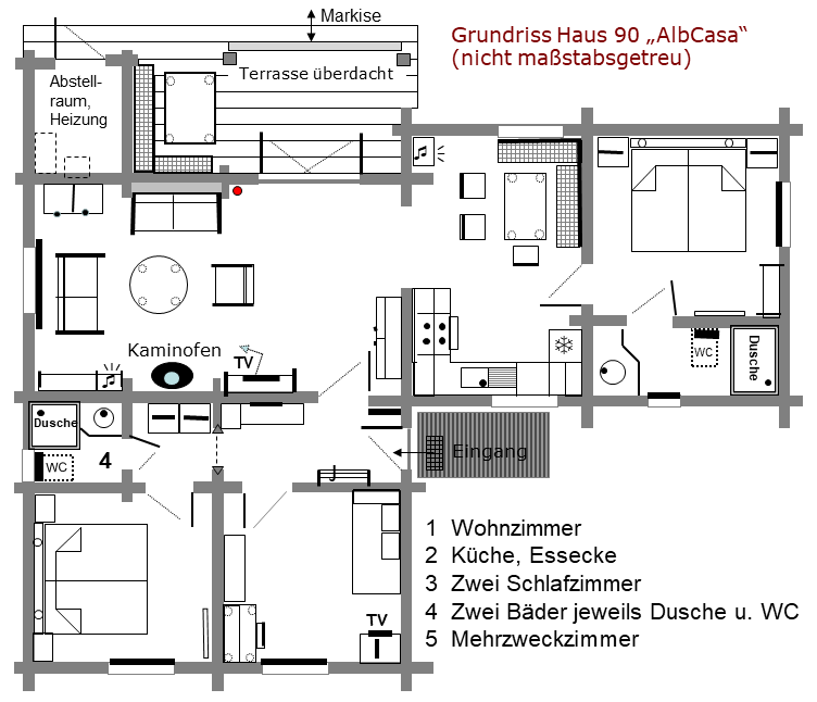Das AlbCasa bietet 2 Schlafzimmer mit jeweils angrenzendem Bad, Küche/Esszimmer, Wohnzimmer, Mehrzweckzimmer und einen geräumigen Flur. Zusätzlich gibt es eine große überdachte Terrasse mit Markise und ein von außen begehbaren Technikraum. Das Haus ist komplett aus Holz, wirkt daher rustikal und ist sehr liebevoll und hell eingerichtet. Die Fenster sind mit Fliegengittern versehen und alle Räume mit Rauchmeldern ausgestattet. WLAN steht für Sie kostenlos zur Verfügung.